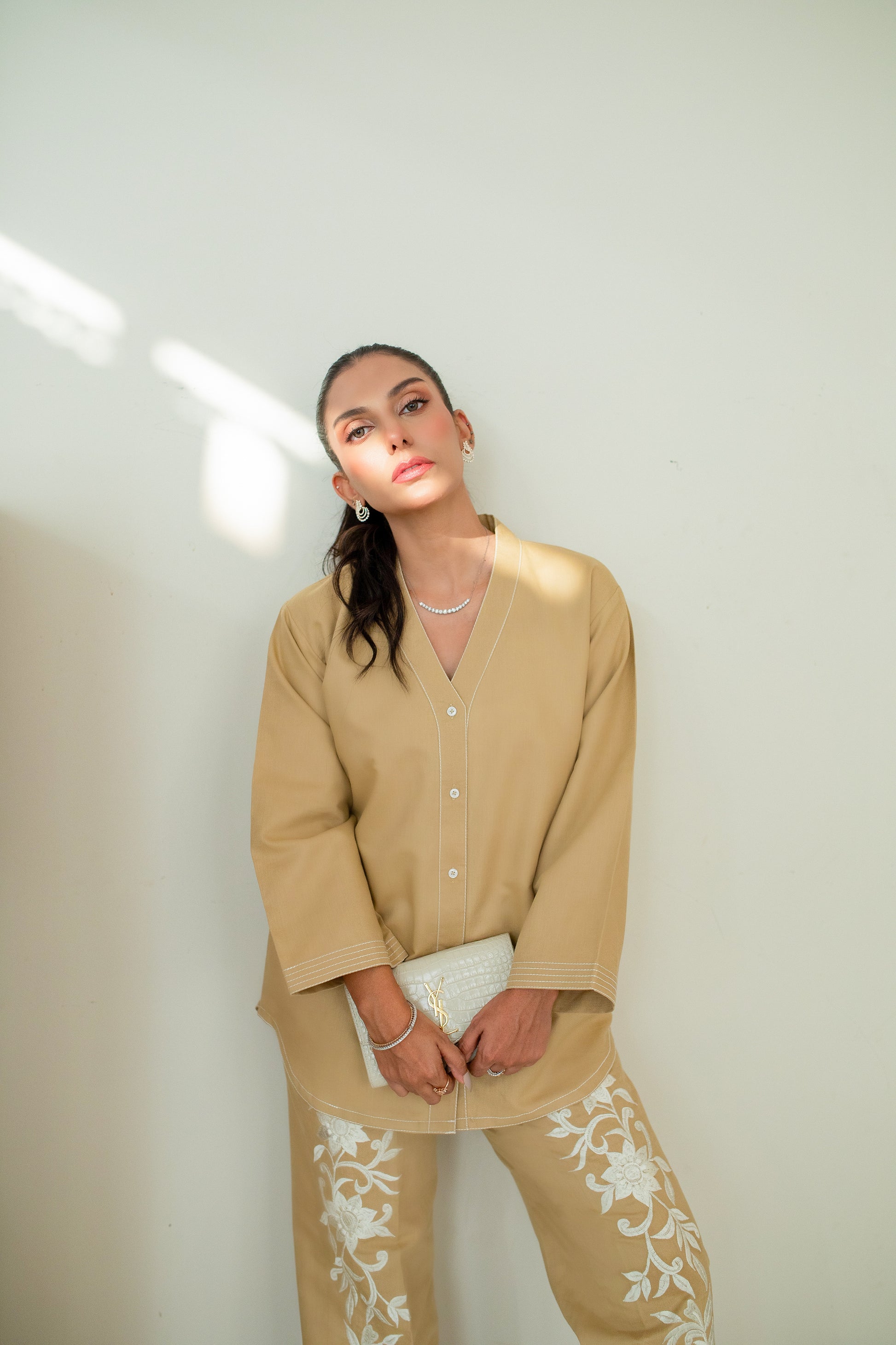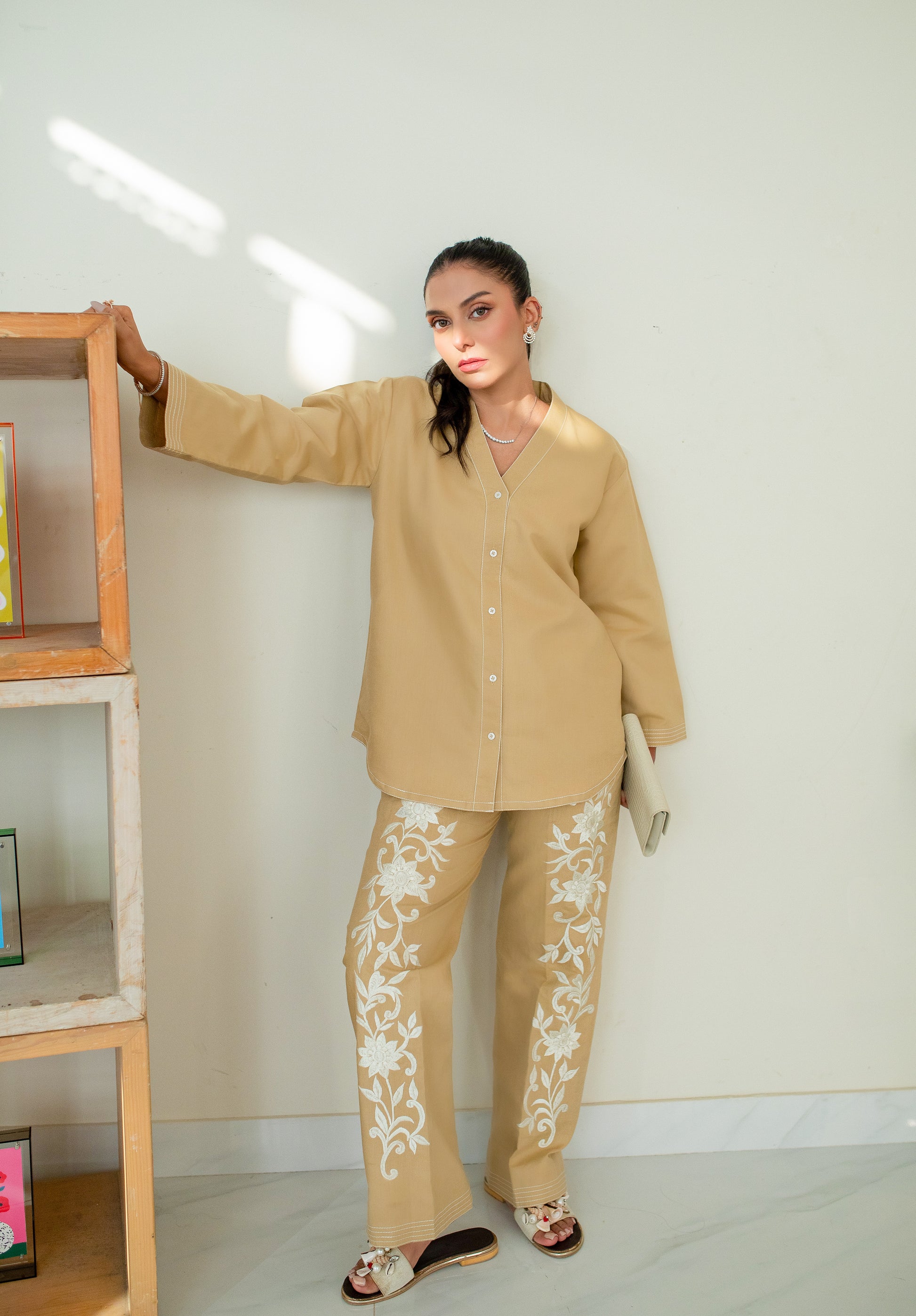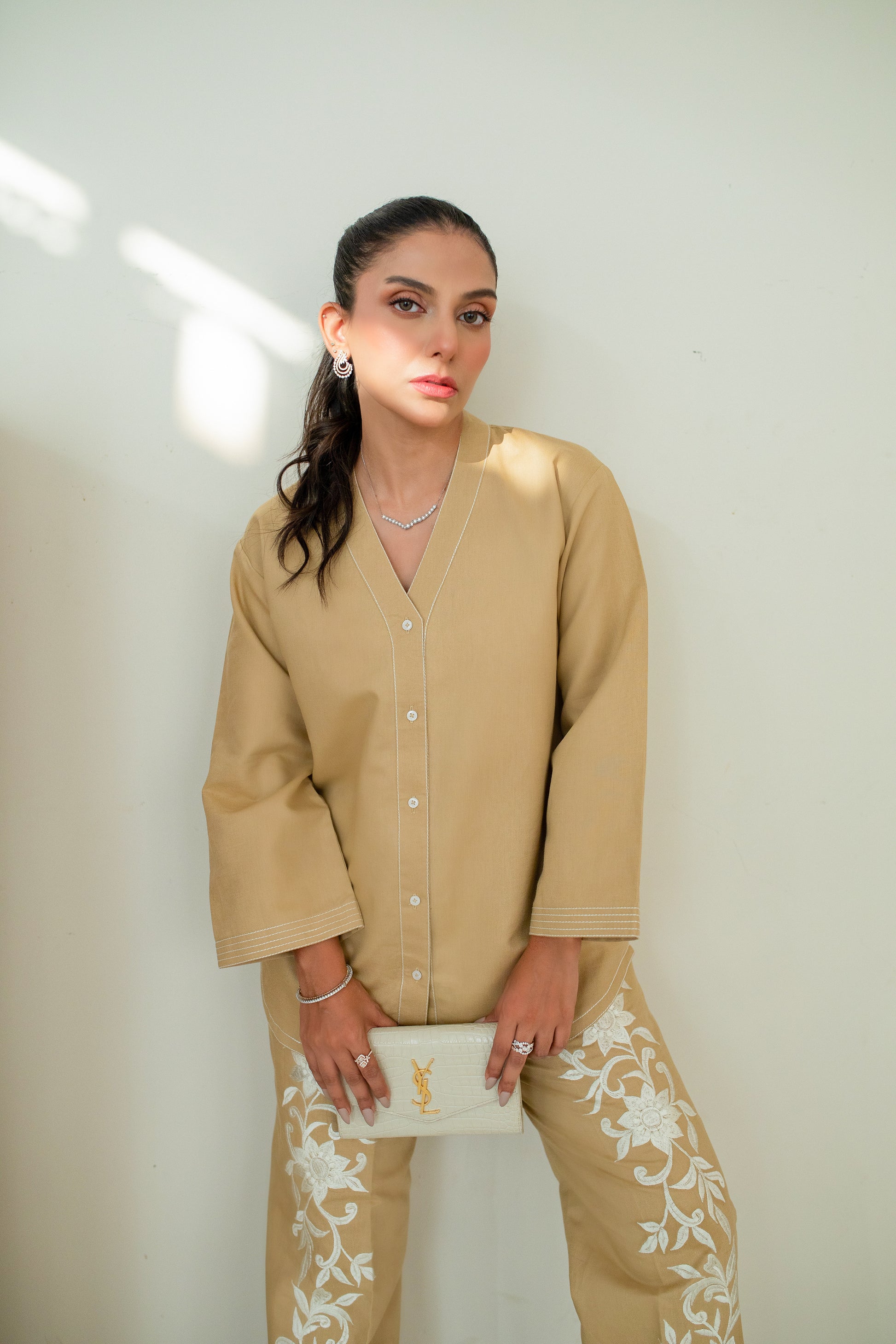 A contemporary two-piece in warm mocha brown, paired with crisp white trousers. The shirt is cut short for a modern silhouette, while the trousers feature fine white embroidery that adds subtle texture and elegance. A versatile blend of earthy tones and refined detailing—perfect for both casual wear and polished occasions.
