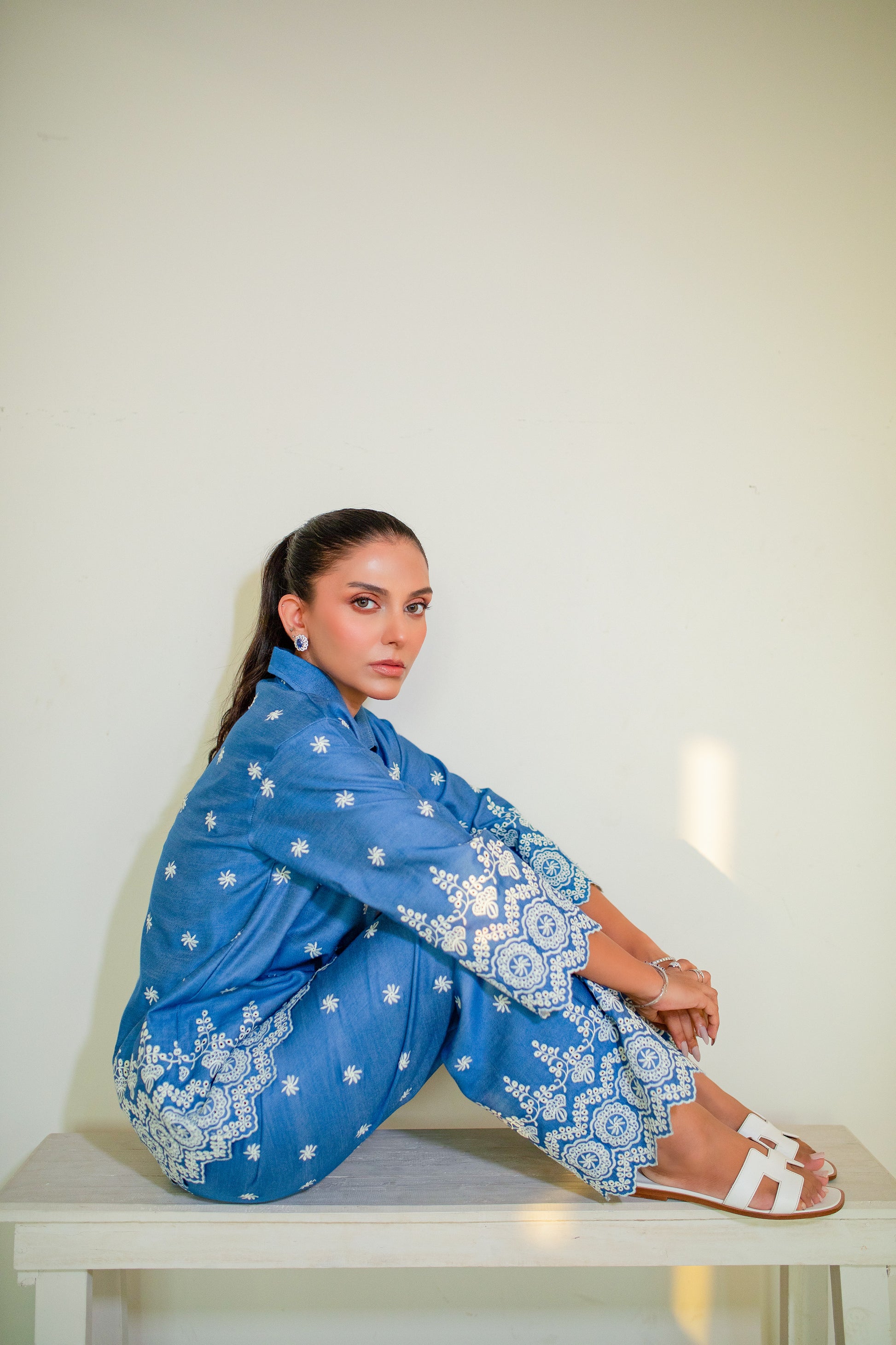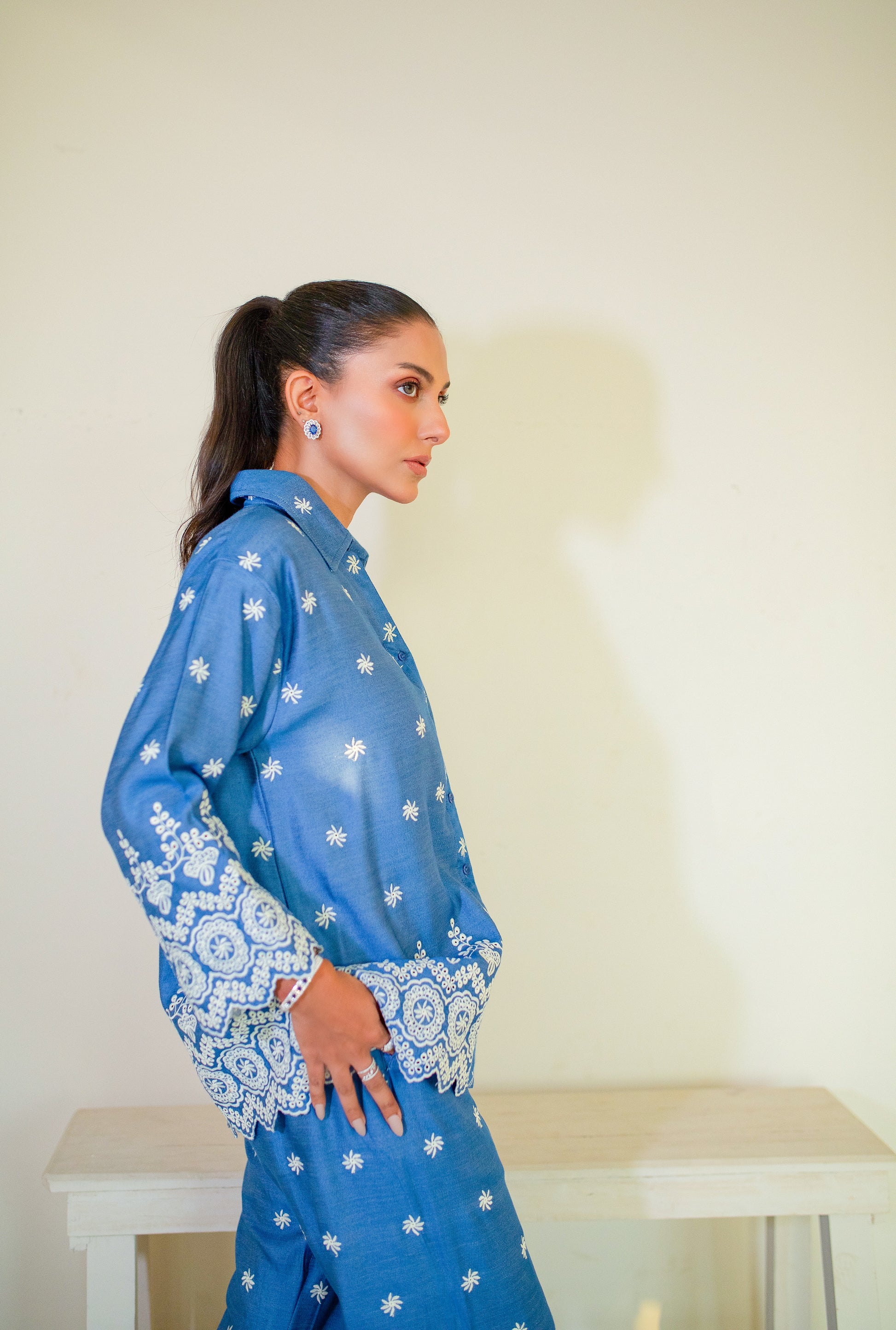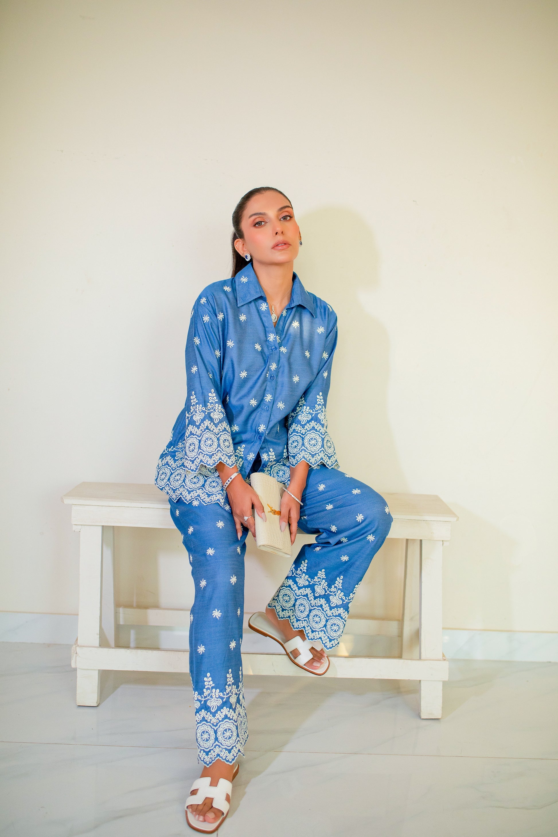This blue embroidered co-ord is a symphony of eastern craftsmanship and western finesse. The kurta-style top carries intricate embroider - delicate yet striking - evoking timeless artistry, while the relaxed, tailored silhouette gives it a contemporary edge. Paired with sleek trousers, the set flows with effortless elegance, striking the perfect balance between cultural heritage and cosmopolitan chic. This set is specifically designed for the woman who carries both worlds with grace.
